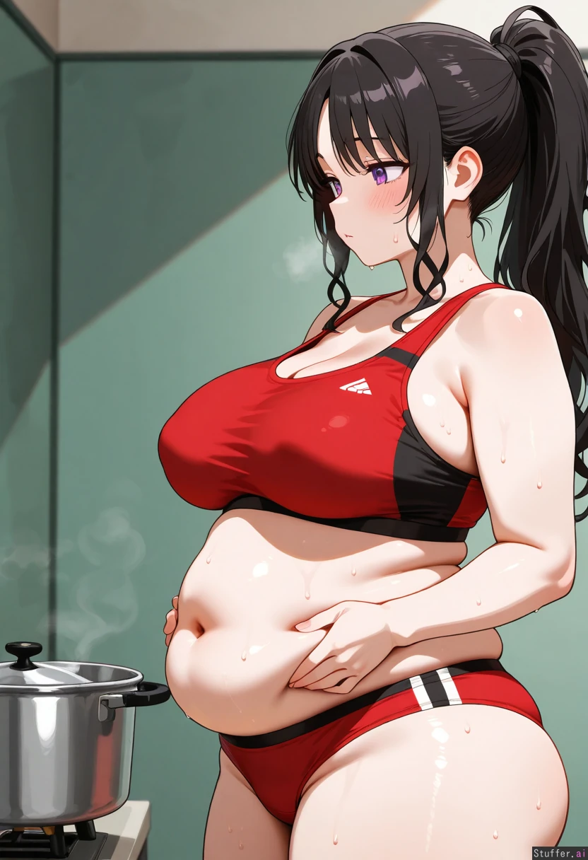 One beautiful 22 year old pot-bellied girl, Kiara. (Gaining_weight: 1.2) Kiara has long black hair, purple eyes. medium sized breasts. Hair in ponytail. Kiara wears a cute red sports bra, cute red sport panties. Kiara's belly is soft and pudgy. Squishy chubby muffin-top potbelly protrudes outwards. Kiara jogs through the park. Her body is covered in sweat. Local park. Side view. (Morbid_Obese:1.0)