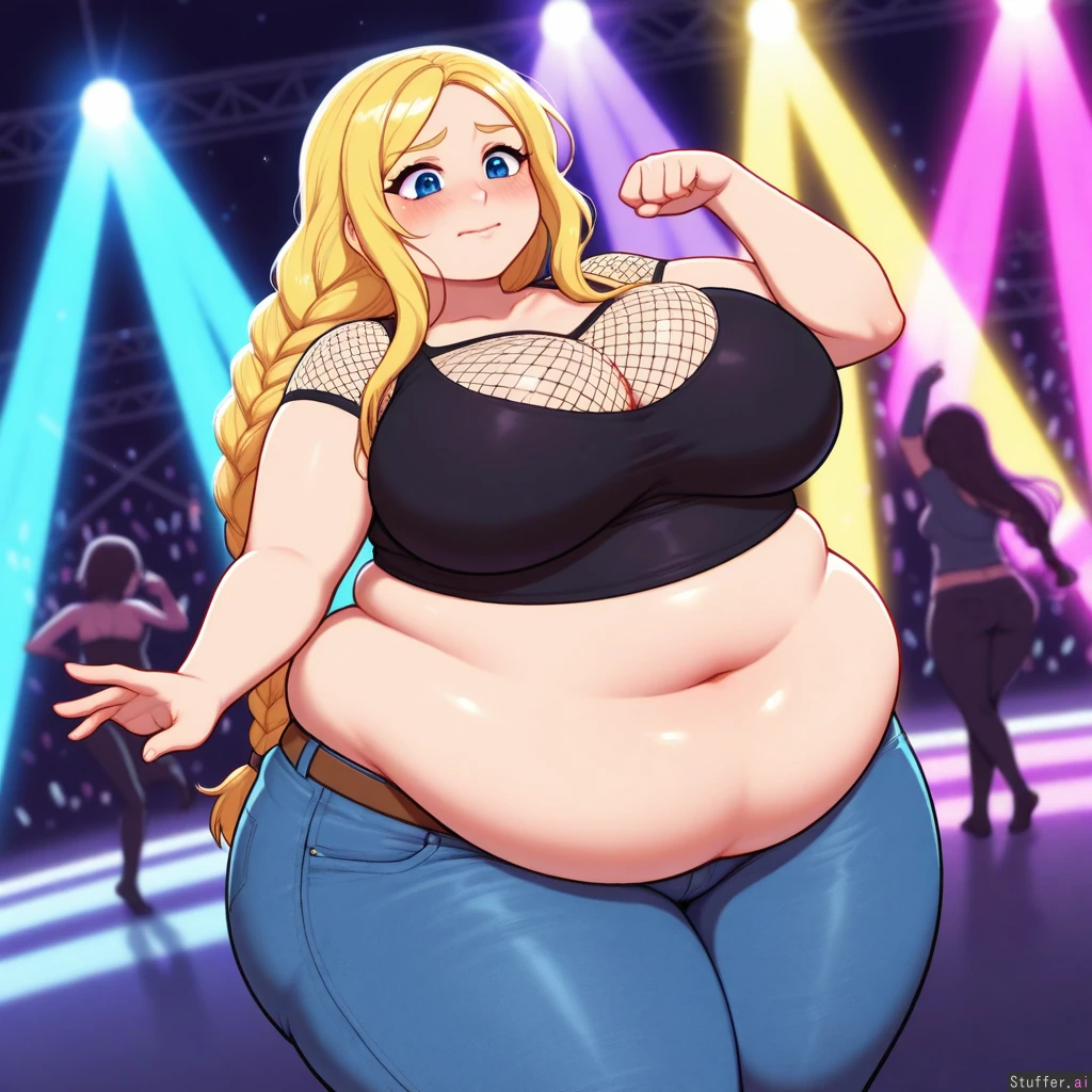 hdr, c.cu, blushyspicy, (betterwithsalt:1.4), best quality, anime, two women, embarrassed, tall, long blond braided hair, blue eyes, plump, pudgy, (obese:1.4), overweight, dancing, huge overflowing cleavage, hyper fat belly, tight Shirt, jeans, fishnets, Rave, club, lights, low light