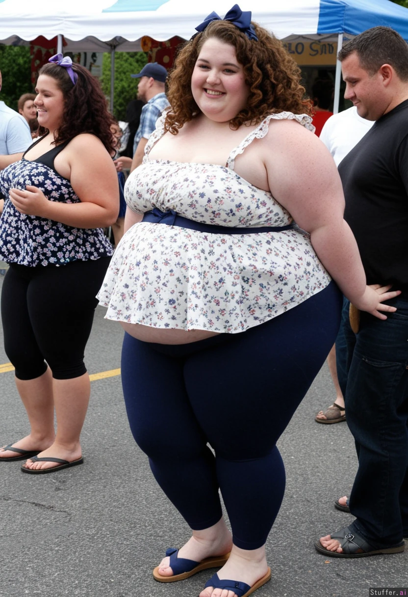 hyper obese ssbbw blob becoming too fat to move, massive belly, Street party, fat, massive thick thighs, heavy cellulite, Flat chested, soft fat arms, smiling at viewer, fully clothed in frilled floral peplum top and navy leggings, wide face, curly, sandles, ribbon bow in hair, belt Side view