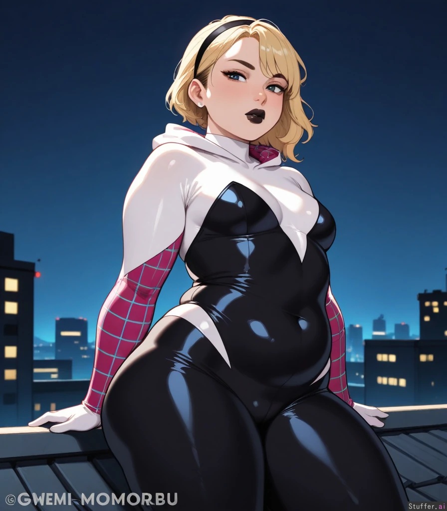 Solo, KAMII MOMORU(artist), ((gwen stacy)), horny, ((tight bodysuit)), ((alt girl, black lipstick, plump lips)), small breasts, ((thick, chubby:1.2)), (serious face), (sexy pose, sexy), thick thighs, round belly, standing, on roof, night, medium breasts, Dramatic lighting, ((looking at viewer))