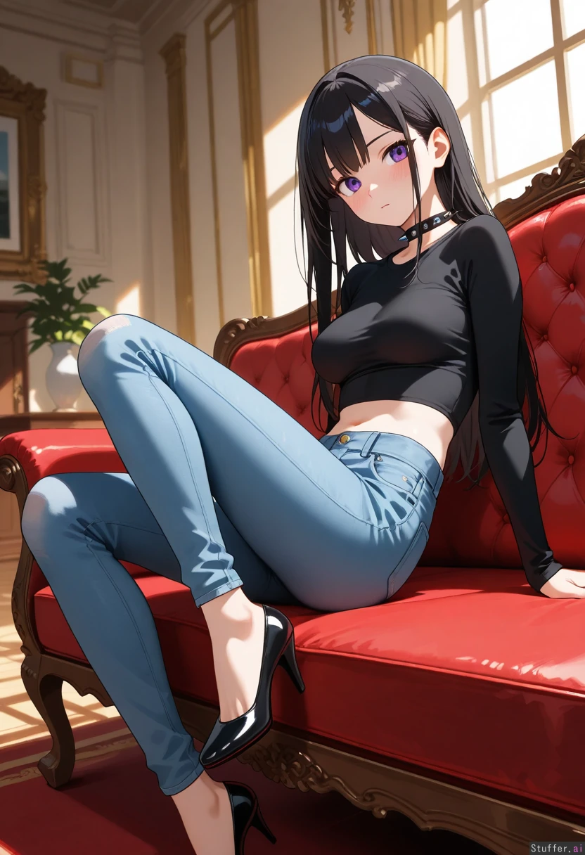 High resolution, best quality, kipteitei_(artist) 33 year old Asian female, long straight black hair, purple eyes, black spiked choker, black tight shirt exposing midriff, blue long jeans, black heels. Sitting on lavish mansion couch. Shy and blushing. Looking at viewer. (Medium breasts, lean body). Side view. Day time. Luxurious mansion room designed to impress guests.