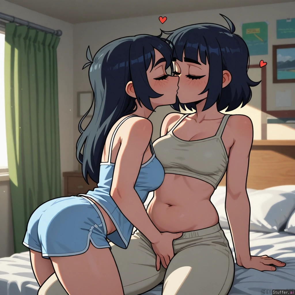 Stopu42, vanripper, chubby young woman, petite, yuri, couple, 2girls, kissing, hugging, grabbing_another's_crotch, bedroom, sleepwear, university campus, medium breasts, medium_belly,