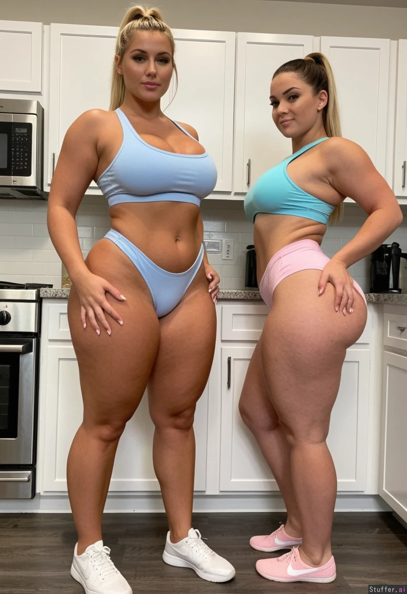 short dutch girl, blonde long har in a tail, super hot girl, gym outfit, light blue nike sportsbra, light pink high waisted gymshorts, super attractive face, 20 year old, facing camera, showing her belly off the her body, Super insane short and thick legs, Big enormous round breasts, slimthick short and fit pearshaped body, enormous super wide slimthick wide hips, small belly, abs visable, small waist, super big enormous thick round ass, short and fit pawg body, super short and wide thick curvy fit body, super big round ass, full body, feet to head in picture, in a white kitchen, standing next to a tall skinny woman with dark brown hair wearing a white sport bathsuit,