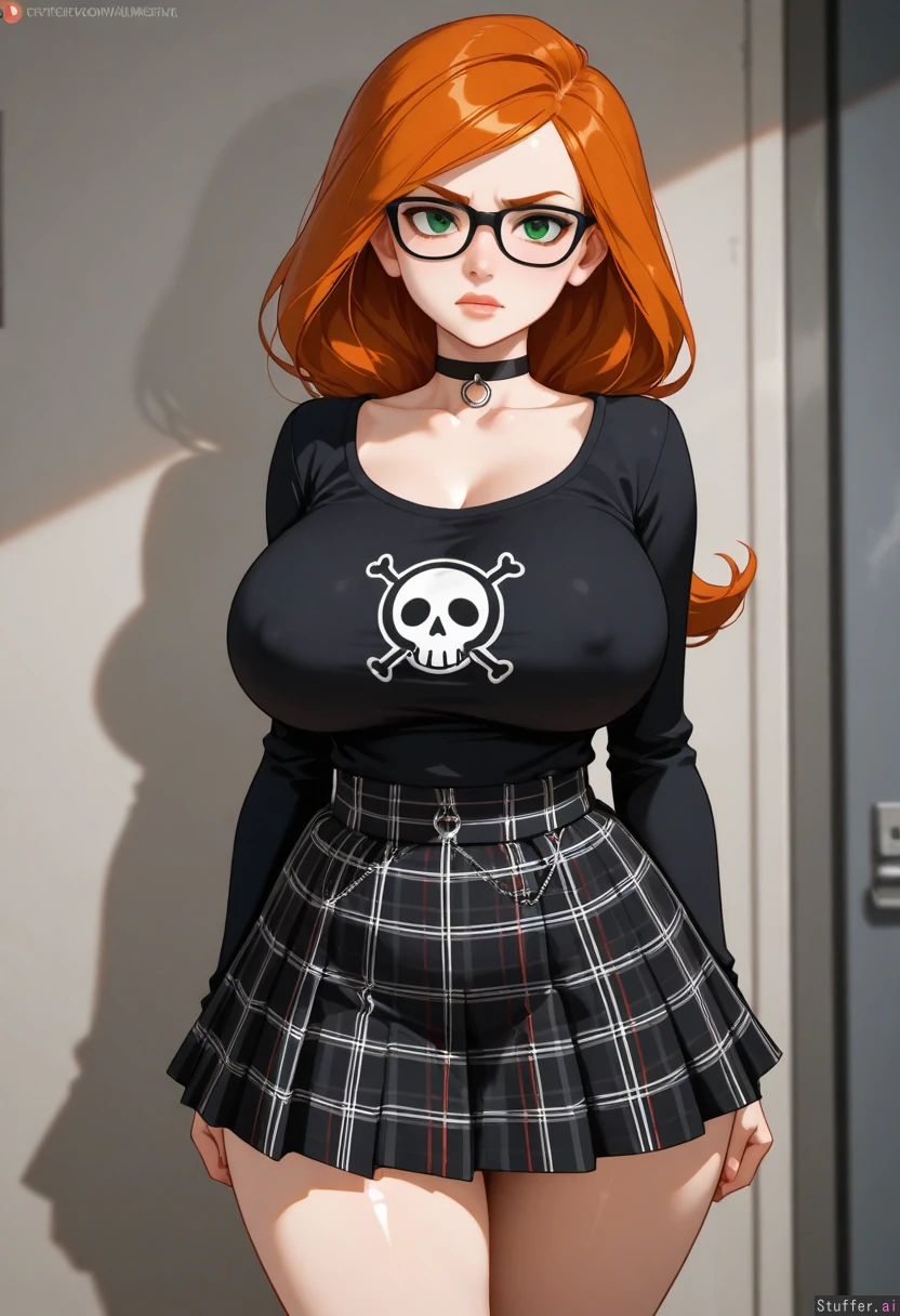 8k, masterpiece, hdr, uhd, highest_quality, Kim Possible, huge_breasts, solo, 1girl, plaid_skirt, goth, choker, glasses, irritated, fancy_clothes, stylish_clothes, haute_couture