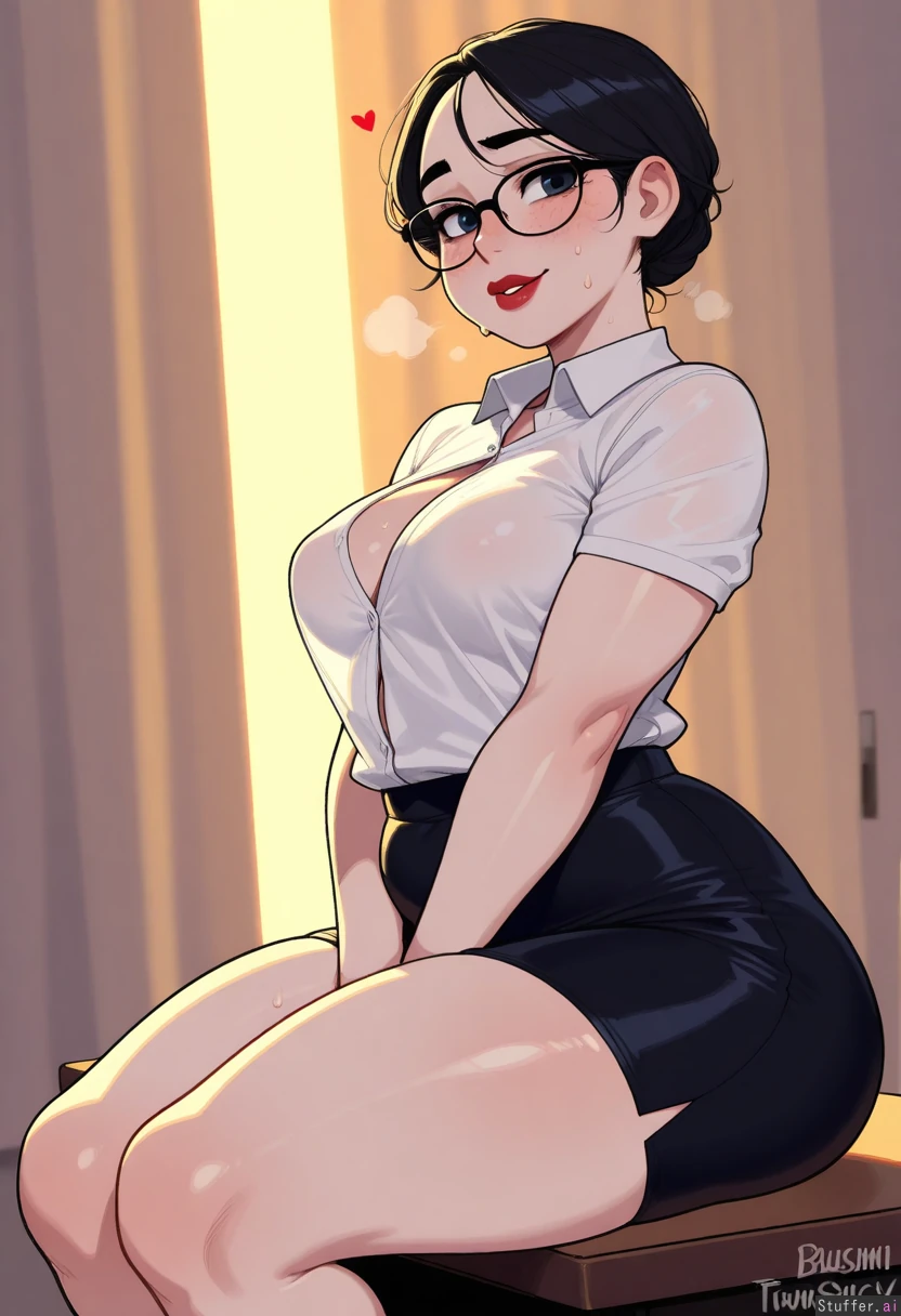 (highly detailed, best quality), (perfect anatomy, perfect proportions), (perfect lighting, warm lighting, vibrant colors, shadow, perfect shading), (beautiful face, beautiful eyes), (Krekkov (artist), KAMII MOMORU (artist), blushspicy, betterwithsalt), one girl, solo office ((Asian girl), (short black hair), (blue eyes, thin eyes), (pale skin, shiny skin, freckles), (adult, tall woman), (full lips), (hearts around head), (white button shirt, button gap, black pencil skirt, red lipstick, glasses), blushing, aroused, heavy breathing, panting, sweating, shy, happy, looking at viewer, seductive (chubby), (small breasts, perky breasts, cleavage), (plump belly), (plump arms, fat arms), (round face, chubby face, plump cheeks, double chin), (narrow waist) side view, sitting on desk, masturbating