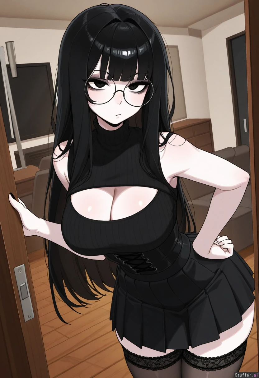 absurdres, 8k, perfect anatomy, masterpiece, beautiful face, beautiful eyes, RockSolidArt. /(artist/), RockSolidArt(artist/) ,8), (merunyaa), (usa37107692:1.2), (ohasi_art), (betterwithsalt) (((One girl))), ((mature)) ((Living room, afternoon)) ((goth girl)), ((black hair, black eyeshadow, pale skin, long hair, messy har, round glasses)) ((Goth clothes, cleavage, black pleated skirt, black crop top, sleeveless, corset, stockings)) ((Bored)) ((Standing))