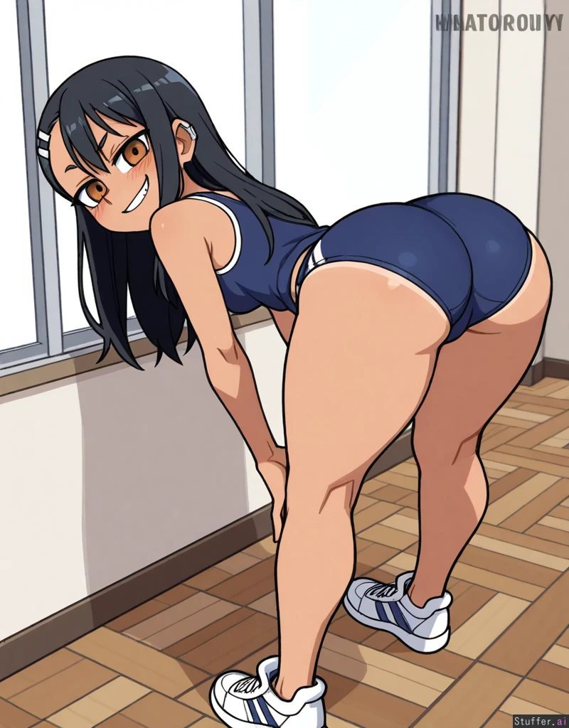 (((perfect detail))), (((high rating))), (sophisticated detail), (highly detailed face), best_quality, vanripper_(style):1.2, (1girl), (solo), (1nagatoro), (tan_skin), hazel eyes, (tight black tank top), (tight navy blue gym buruma), (white-black sneakers), slim_waist, small_breasts, thick_thighs, (wide_hips), (big_ass:1.0), (fat_ass), (standing), (looking_back), (from_behind, from_side), (presenting_hindquarters), mischievous smirk,