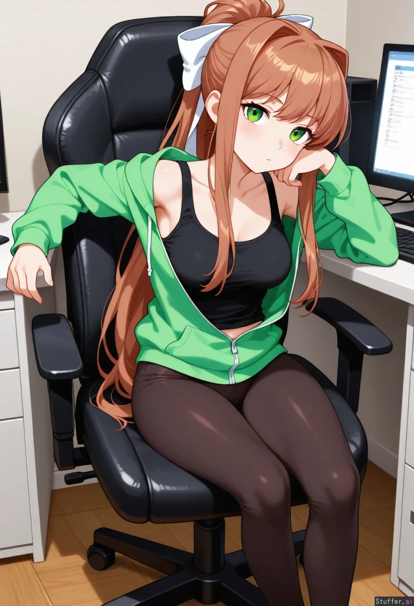 Solo, monika_(doki_doki_literature_club), using computer, computer chair, bored, bedroom, unzipped hoodie, tank top, leggings, medium breasts