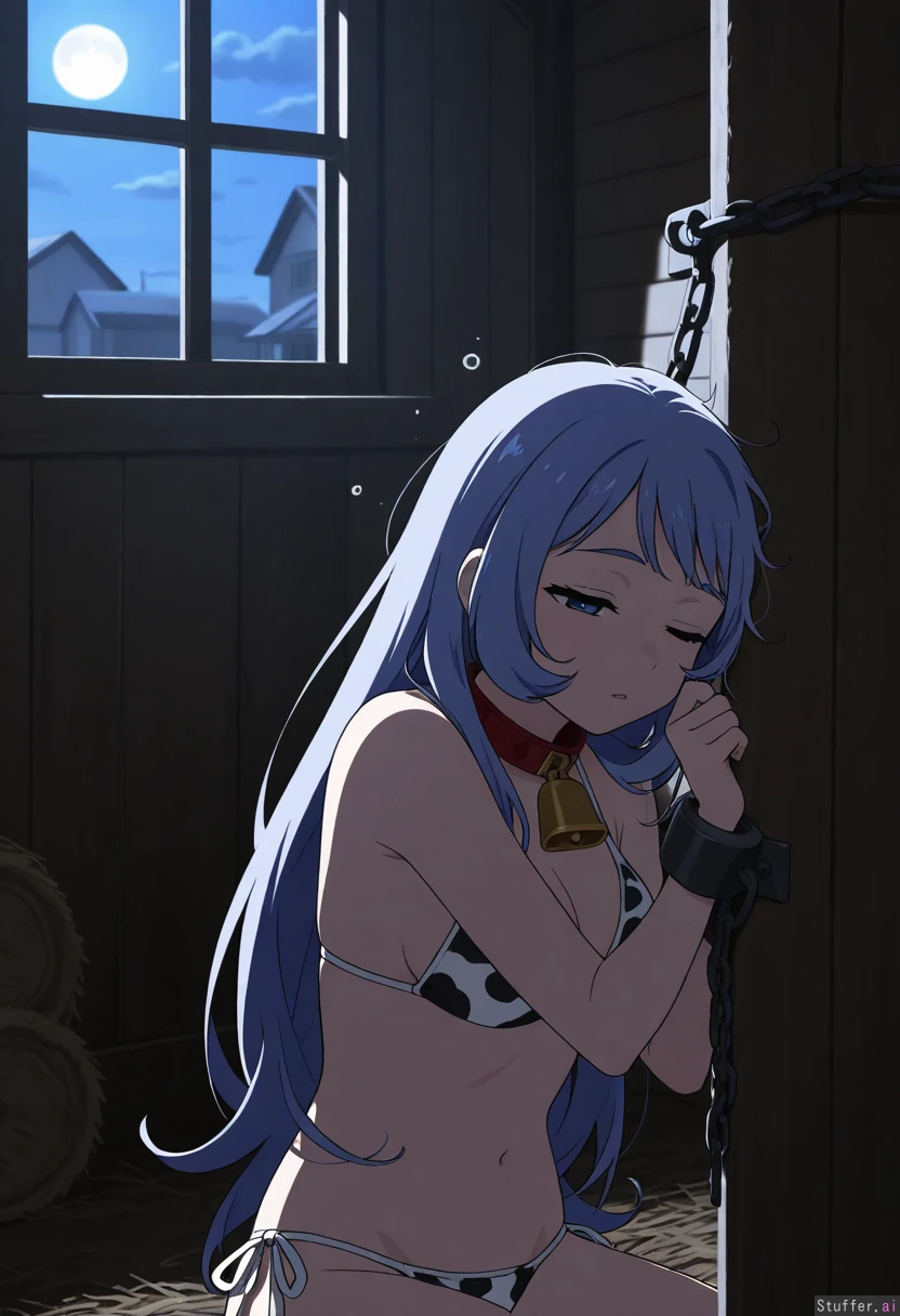 (( 1girl, solo, HDR, simple_style, (((flat_colors))) )) (( Nejire (mha), long_hair)) (( cow_print_bikini, cow_bell, red_collar)) (( Night, moonlight, dark_lighting, barn, window)) (( chained_wrists,, on_ground, half-closed_eyes, sleepy, leaning_on_wall))