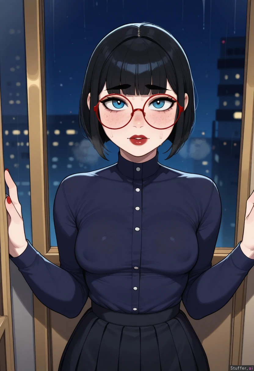 (highly detailed, best quality), (perfect anatomy, perfect proportions), (perfect lighting, warm lighting, vibrant colors, shadow, perfect shading), (beautiful face, beautiful eyes), (Krekkov (artist), KAMII MOMORU (artist)), one girl, solo bedroom, night, rainy window (Asian girl, adult, mature, (shortstack), sexy librarian), (short black hair, swept bob hair, blunt bangs), (blue eyes, large eyes, eyelashes, flared lashes), (pale skin, shiny skin, ((freckles, mole on face))), (Dark blue button shirt, fully clothed), (high waist pleated skirt, very long skirt), (red lipstick, red fingernails, glasses), skindentation (blushing, aroused, heavy breathing, panting, horny, entranced), (((((sweating))))), shy, submissive, looking at viewer (slim, toned body), (round face), (smaller breasts:1.5), (narrow waist), (narrow hips), (small ass), upper body, sexy pose