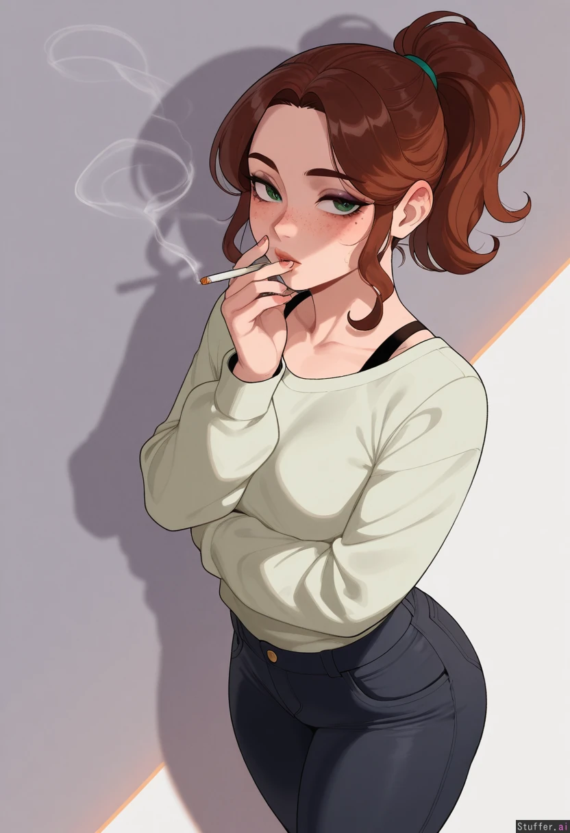 (highly detailed, best quality), (perfect lighting, vibrant colors, shadow, perfect shading), (Krekkov (artist), KAMII MOMORU (artist), nyantcha (artist)), solo, adult, (Brown bangs and ponytail, green eyes, mascara, mole under eye, freckles) Wearing: (plain white sweatshirt), (black jeans), (Flatchested), (Blushing), (smoking a cigarette), Skinny, (Chubby: 0.60),