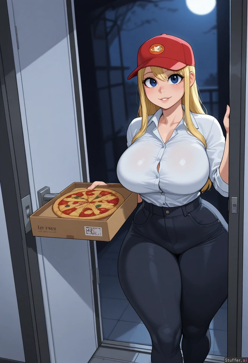 krekkov(artists), KAMII MOMORU(artist), solo ((Lucy Heartfilia, blonde hair)), blue eyes, mascara, (( White_shirt, button_shirt, collared_shirt, black_jeans, red_pizza_delivery_hat, thin_waist, thick_amrs)) (( large_breasts:1.1 )) (( thick_thighs:1.1 )) (( doorway, moonlight, holding_pizza_box, hand_on_hip))