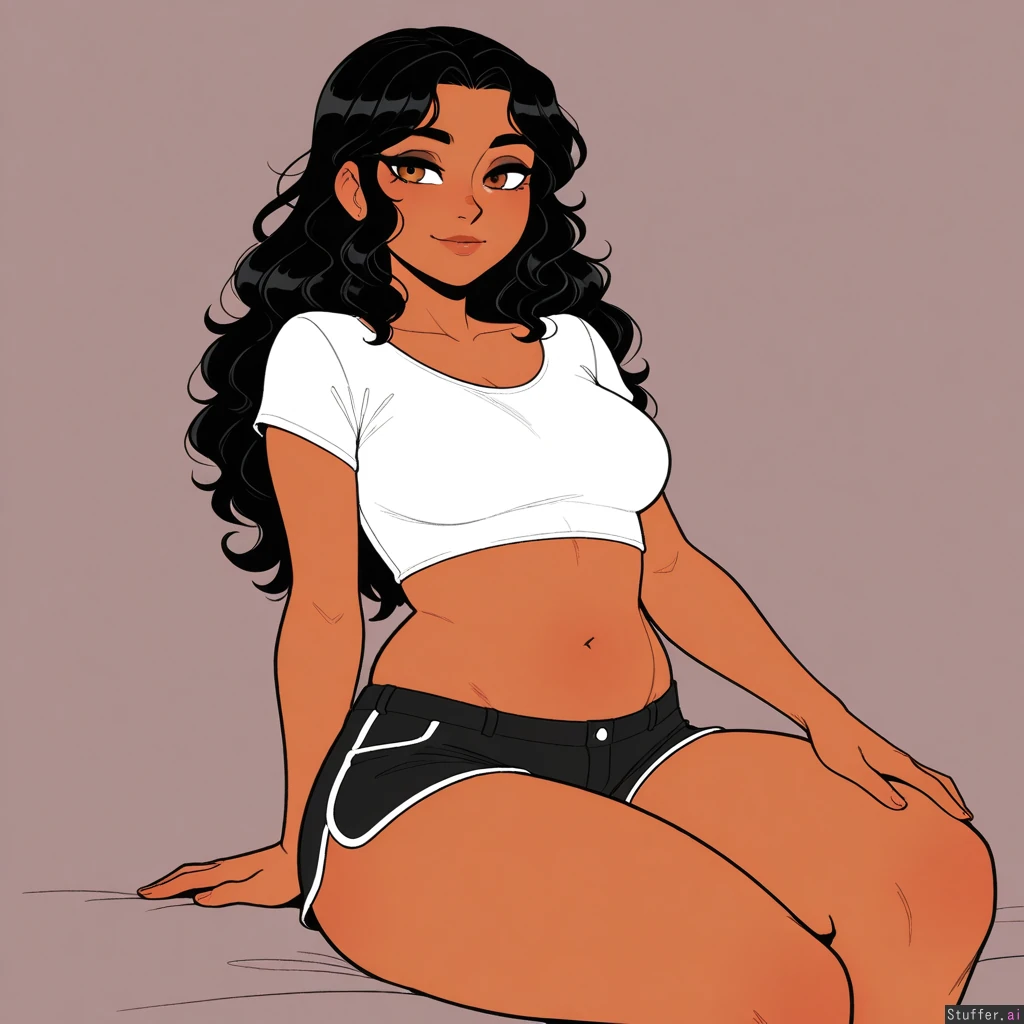 Scruffyturtles(artist), pudgeruffian(artist), masterpiece, hyper resolution, hyper realistic, best quality, high rating, flat colors, solo, (Latina), ((Long wavy black hair)), (brown eyes), (wingtip eyeliner), (tight white crop top), (black short shorts), ((brown skin)), medium breasts, (Sitting), (neutral background), (Overweight:0.0), (chubby cheeks:0.75), (Slightly Bloated_belly:0.00), ((Pizza in mouth:0.0)), ((Rubbing belly:0.0)), ((Bloated:0.0)), ((Surprised_expression:0.0)), ((Voluptuous figure)), ((Tight_belly:0.0)),