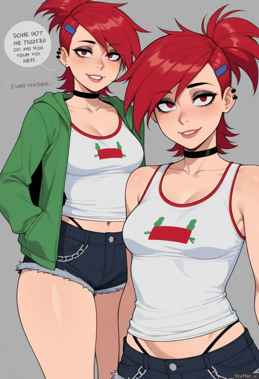 ((punk)), ((frankie foster)), (adult:1.2), krekkov(artist), KAMII MOMORU(artist), choker, scarlet_eyes, (detailed face), ((dark eyeliner)), navel piercing, thong showing, (((flared hips, chubby, drunk, wasted:0.5))), small breasts, tanktop, unbuttoned shorts, (((bottom heavy, midriff peek:1.3)))