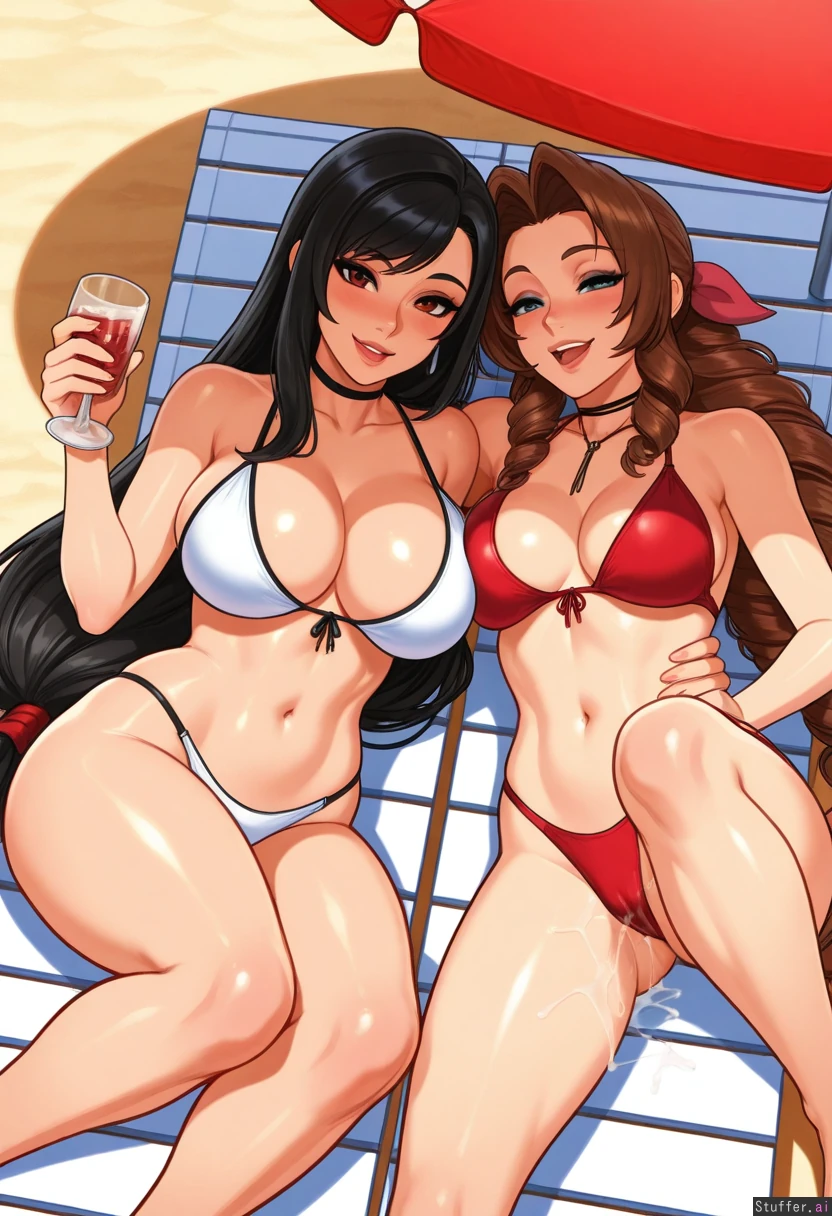 2girls, (Tifa_lockhart, aerith_gainsborough), ((eyeliner)), choker, drunk, cum_drip, (((lounging in two beach chairs))) ((reiq(artist)): 1.0), ((Blushyspicy(artist)): 0.6), (((cumflation), (belly_bursting_out_of_clothes), (large_breasts), (gigantic_belly), (thick_thighs), (morbidly_obese), (love_handles), ): 0.50),