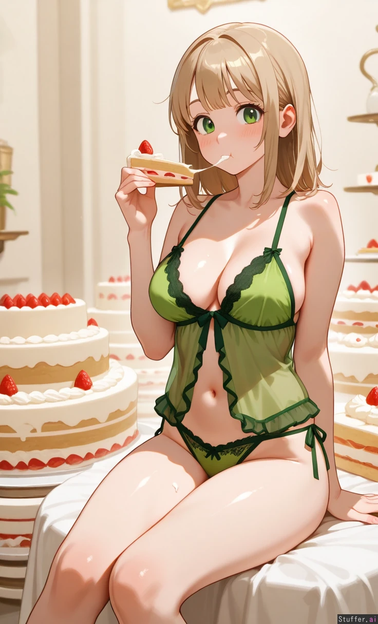 green_eyes, light brown hair, bangs, Skimpy green one piece lingerie, (((breasts:1.0))), (((saggy breasts:0.0))), (((wide hips:0.2))), Sitting in pile of cake, Cake room, , (((Eating cake:1.0))),