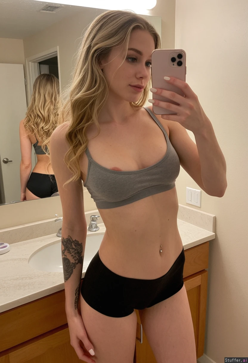 (best quality), (high rating), (highly detailed), (masterpiece), (sophisticated quality), (best shading), girlfriend, young woman, long slightly wavy blond hair, light skin, subtle makeup, (slim athletic body, (small_belly:1.3), narrow waist), round breasts, curvy hips, slim legs, tight bra, black tight Shorts , tattoos on torso and arm, holding smartphone, mirror selfie, warm bathroom lighting, belly and breast sticking out, trying to impress with her breast, (Skinny body)