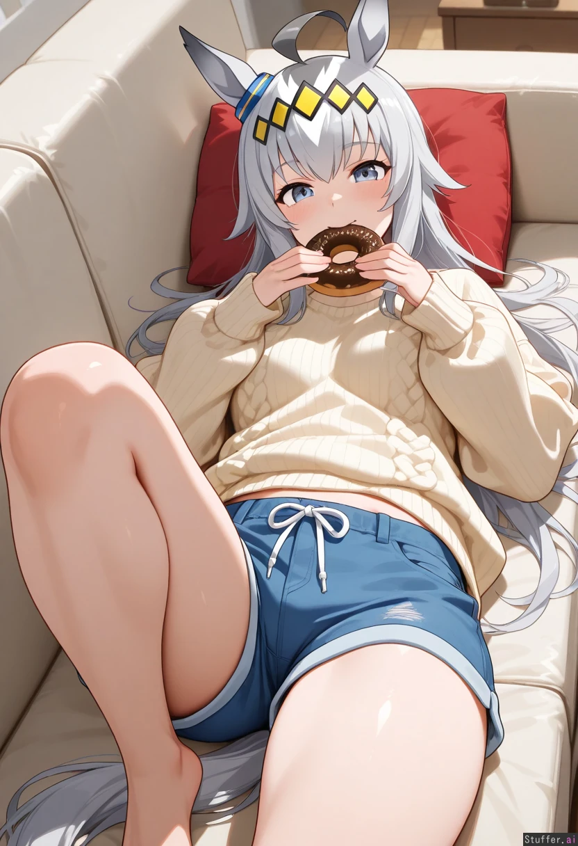 Oguri cap from umamusume, wearing a baggy sweater and short casual shorts, laying lazily on a couch, spoiled, adult, (thick thighs:0.8), eating out of a large box of doughnuts