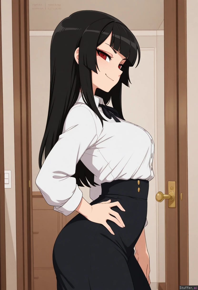 masterpiece, best quality, score_7. (Simple style:1.3), (less detail), flat colors, color, room, extreme proportions, (Girl A: white button shirt, high waist skirt, eyeliner, raised eyebrow, smirk, looking at viewer, standing), Side profile, red eyes, bangs, black hair, hand on hips, Lewdlemage, merunyaa,