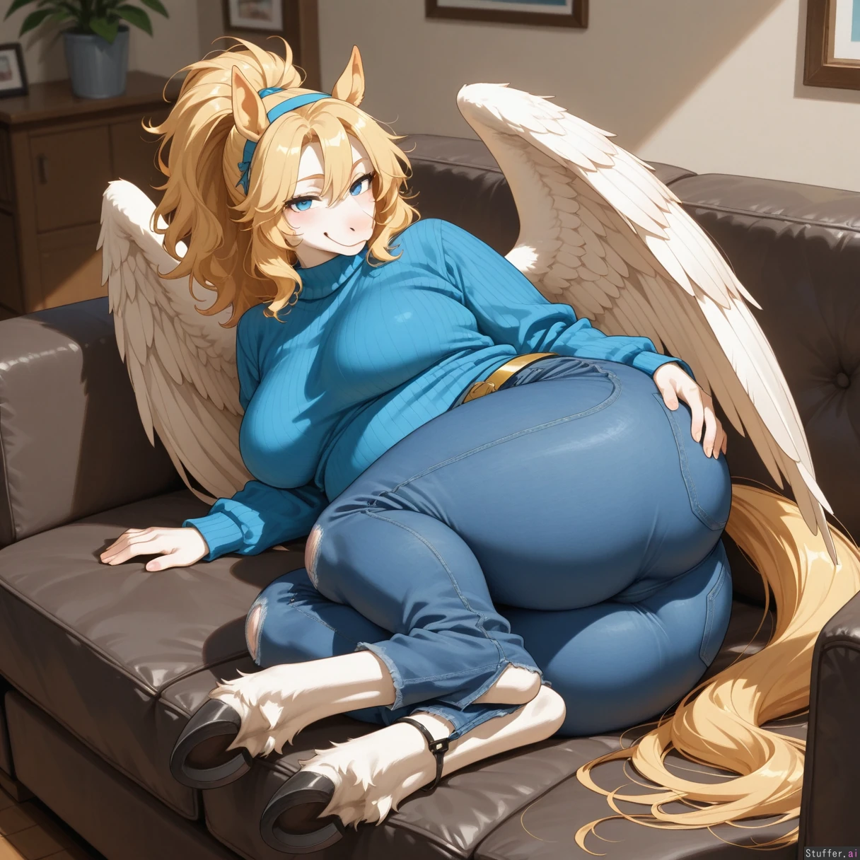 (perfect hands), 1girl, furry, anthro pegasus, detailed white fur, big blue eyes, messy blond ponytail, blue hairband, (horse snout, white feathered wings, horse tail), Smug, horny, displaying, Wearing blue sweater, distressed jeans, gold belt, Soft full breasts, wide hips, thick thighs, digitigrade hooves, Chubby peek, Laying on side, Background: living room, couch,