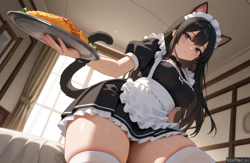 8k quality, perfect anatomy, detailed background, beautiful face and eyes,bedroom, detailed face Maid uniform, cat girl, cat ears, cat_tail, black long hair over shoulders, thick thighs, medium breasts, maid skirt Plate of food in hand, moving lines around thighs Front view