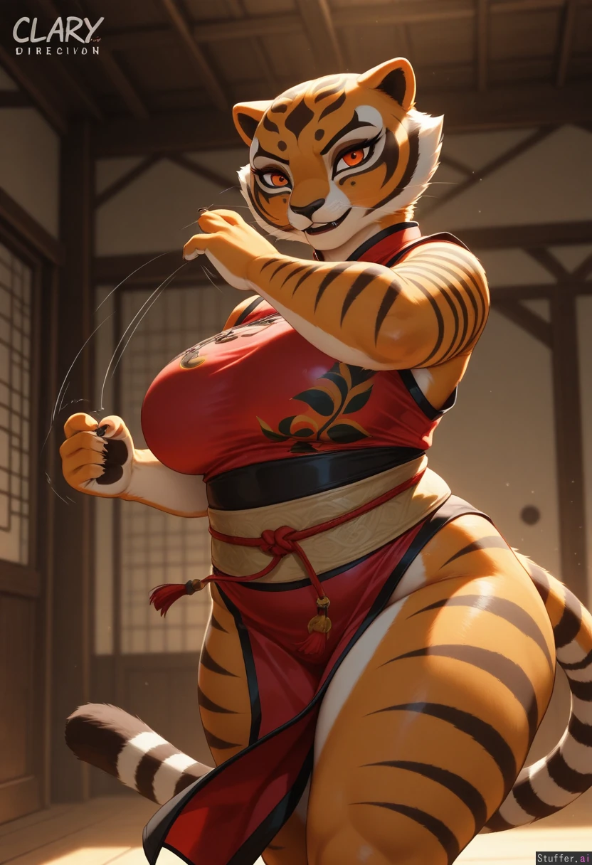 Hyper ultra quality Ultra UHD 8k, hyper realism, masterpiece, perfect, Furry, anthro female tigress (from Kung fu Panda), mature, (((hyper_curvy_body:0.8))) (best quality), (hdr), (detailed background), (motion lines), (expressive), (high rating), (highly detailed), intricate detail, (definition lines), detailed face, (highly detailed eyes), (glossy realistic skin), (good lighting), (detailed face), (clarity), Chubby, thick_thighs, bellyheavy,