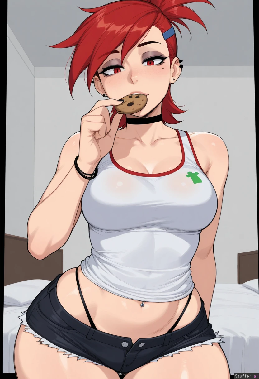((punk)), (((frankie foster))), (adult), krekkov(artist), KAMII MOMORU(artist), choker, scarlet_eyes, (detailed face), ((dark eyeliner)), navel piercing, thong showing, medium breasts, (sleeveless, tanktop, unbuttoned shorts), (((bottom heavy, midriff peek, wide hips))), solo_female, looking down at belly, bedroom, (eating cookie, dramatic angle), (((fat tummy, sad:0.5)))
