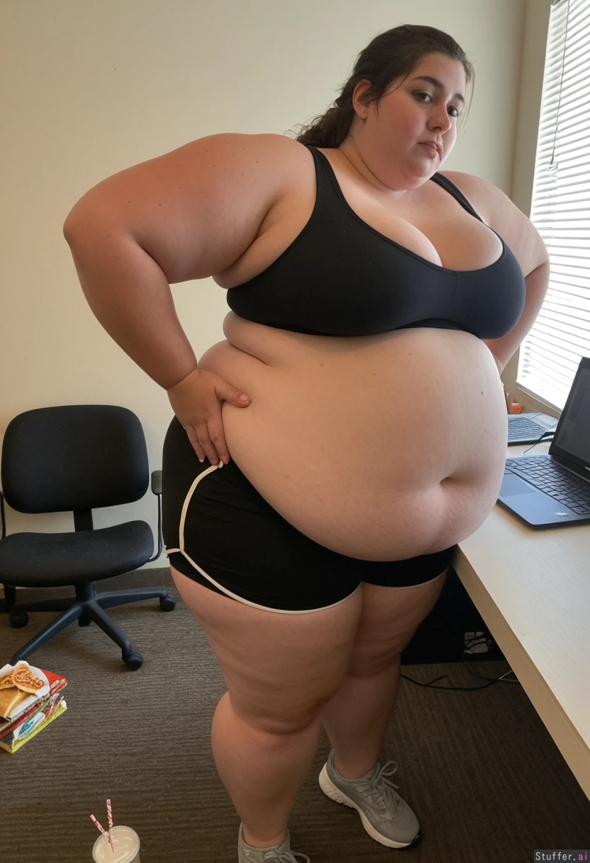 Voluptuous busty flabby soft hefty hyper morbidly obese cute Latina-American woman in her early 20s, gamer girl gaining weight on purpose, thickening, softening, side_view, full_body_view. (Ample curvy flabby heavy voluptuous obese body, round luscious spilling obese curves). Stunning beauty, cute, aesthetic upturned nose. wavy chocolate brown hair. Obese skin, plump light lips, long round face. ((Obese soft squishy meaty breasts)). (squishy flabby heavy gut belly:1.5), (soft squishy thighs). (chunky heavy flabby oversized arms:1.4) ((Skimpy Sports bra, sweat shorts, bulging squished cleavage:1.3)), ((skindentation, folds of fat, rolls of bulging fat)), (Standing at desk with laptop notes and books, middle of gaming room, completely out of shape, struggling with consequences effects of morbid obesity, fast food, milkshakes, mobility struggles, constantly snacking on fast food, massive amounts of fast food, messy, extremely out of shape, consequences of extreme gluttony and excessive obesity, massive mobility issues, greedy:1.5).