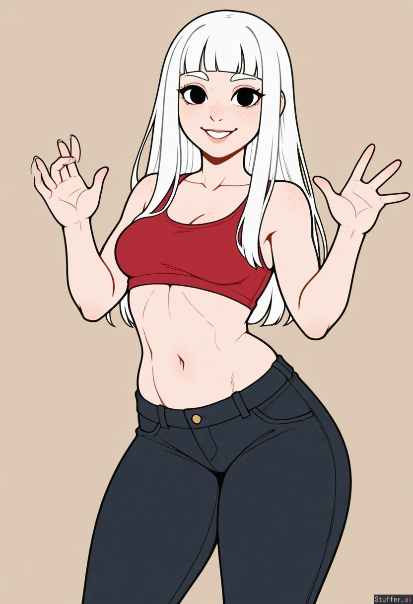 (Kinkymation(artist):0.5), (pudgeruffian(artist):0.3), Beige background, 1girl, solo, (simple style), ((less detail)), ((flat colors)), white hair, long hair, blunt bangs, round eyes, black eyes, eye liner, cute face, freckles, looking at viewer, big smile, waving, light skin, slim, toned belly, midriff, (Red_tank_top, black jeans), ((tight clothes)), Flatchest, cleavage, topheavy, breast_expansion, ((thick thighs)), wide hips