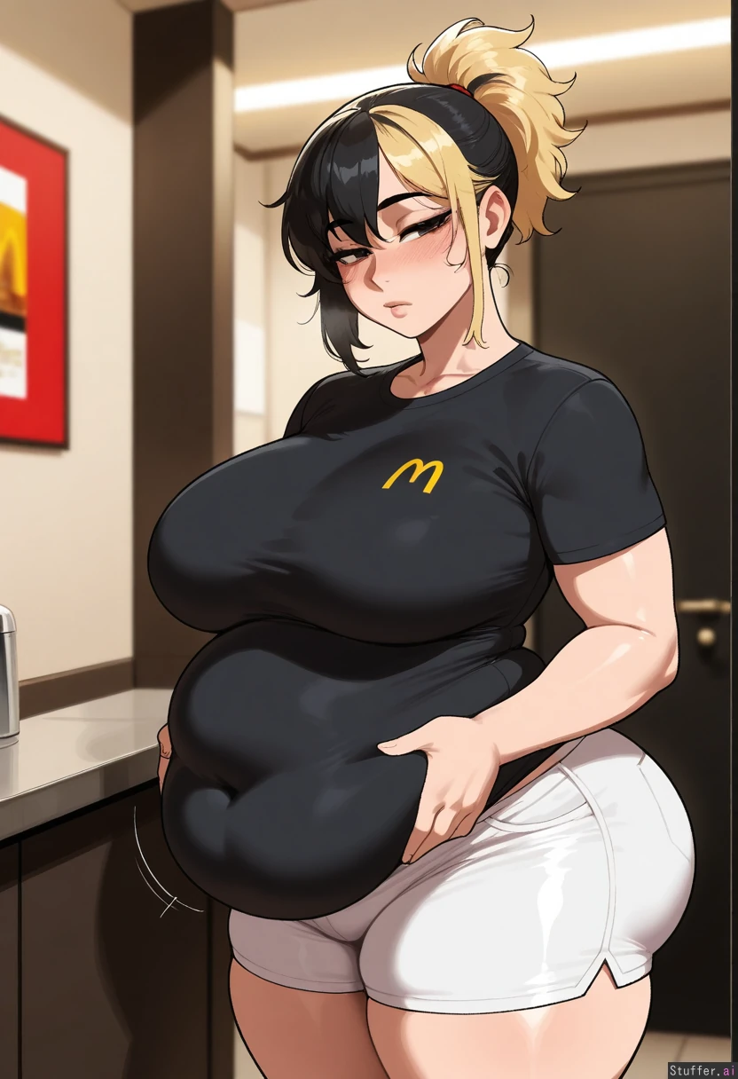 solo, masterpiece, amazing resolution, nyantcha(artist), krekkov(artist), dramatic lighting, standing up, skindentation,(high ponytail), tall,(black shirt),((white shorts)), large breasts, looking at viewer, half closed eyes, tired, blushing,(detailed obese body:0.8), deep navel, wide hips, big ass, (obese, big belly, weight gain fetish),1woman,(black and blonde hair),(dyed black and blonde color),((black dyed hair)),(mostly black color on hair),dark brown eyes,((black hair)),(short ponytail),inside a mcdonald's,