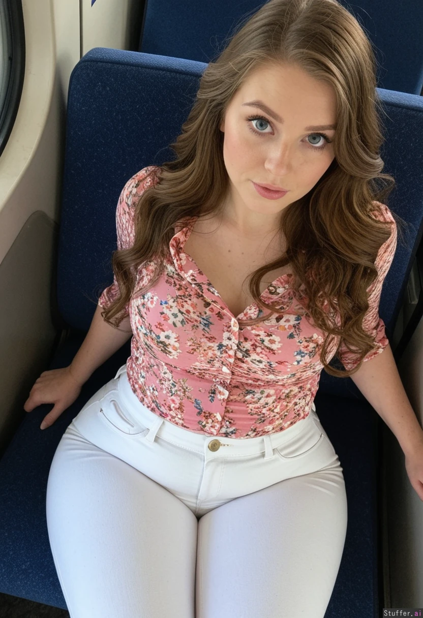 View from above Sitting on public transport White jeans Pink floral blouse Large blue eyes Long flowing wavy brown hair ((Extremely wide hips)) Slim waist