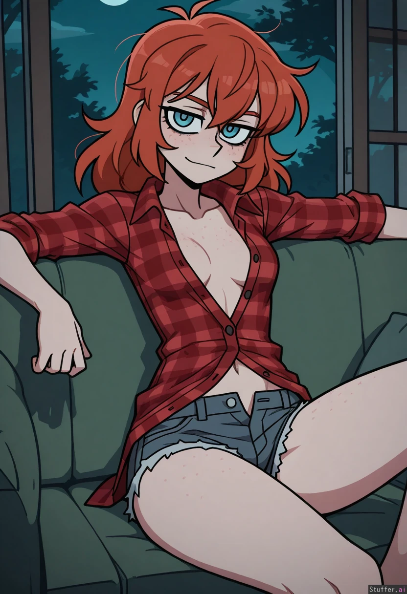 vanripper (artist), masterpiece, hyper resolution, beautiful face, best quality, high rating, (solo), 1female (Long maple hair, messy hair), (blue eyes), freckles, (looking at viewer), night time, sitting on couch, (Unbuttoned flannel, green), (torn unbuttoned jean shorts), (narrow hips), nerdy, freckles, freckled thighs, small tits, canadian, skinny, skinny thighs