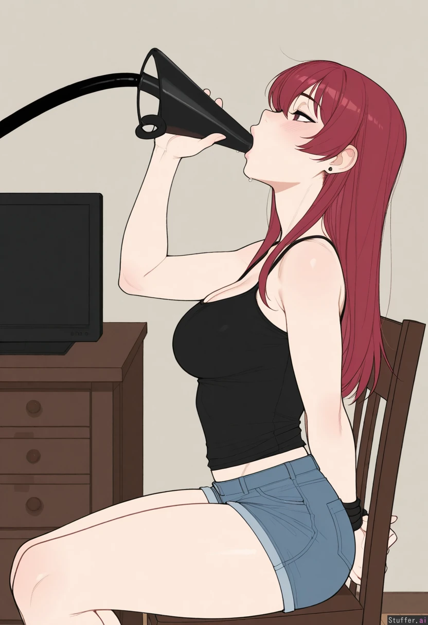 Solo, Krekkov (artist), KAMII MOMORU(artist), (Flat colors), perfect proportions, pale skin, houshou_marine(hololive), red shoulder length hair, flirty, (((black top, jean shorts))), living room, sitting on a chair, hands tied behind her back, (black hose in her mouth, funnel feeding, force feeding), (Side view), medium breasts, (Skinny, relaxed: 0.9) (Chubby, nervous, chubby belly: 0.1)