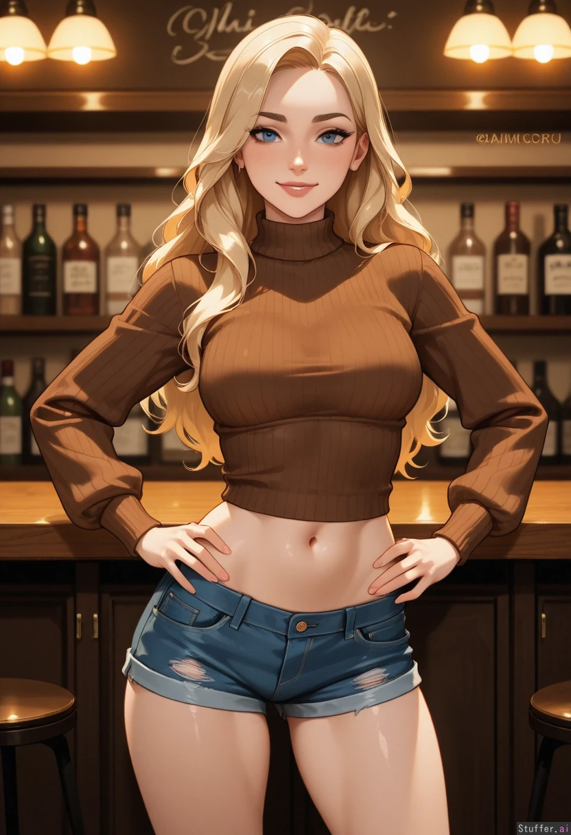 uhd, high resolution, flawless, cinematic lighting, best_quality, Solo, 1woman, milf, adult, (KAMII_MOMORU:1.0) (kittew:1.0), warm lighting Cafe setting, Cafe background Blonde wavy hair, pale skin, blue eyes, sexy face, bangs, Smiling, looking at viewer, arms on hips, standing, legs spread, feminine pose Tight Brown sweater, denim shorts, Slim, athletic build, skinny figure, exposed midriff, tone belly, (Large breasts:0.2), (Weight gain: 0.0)