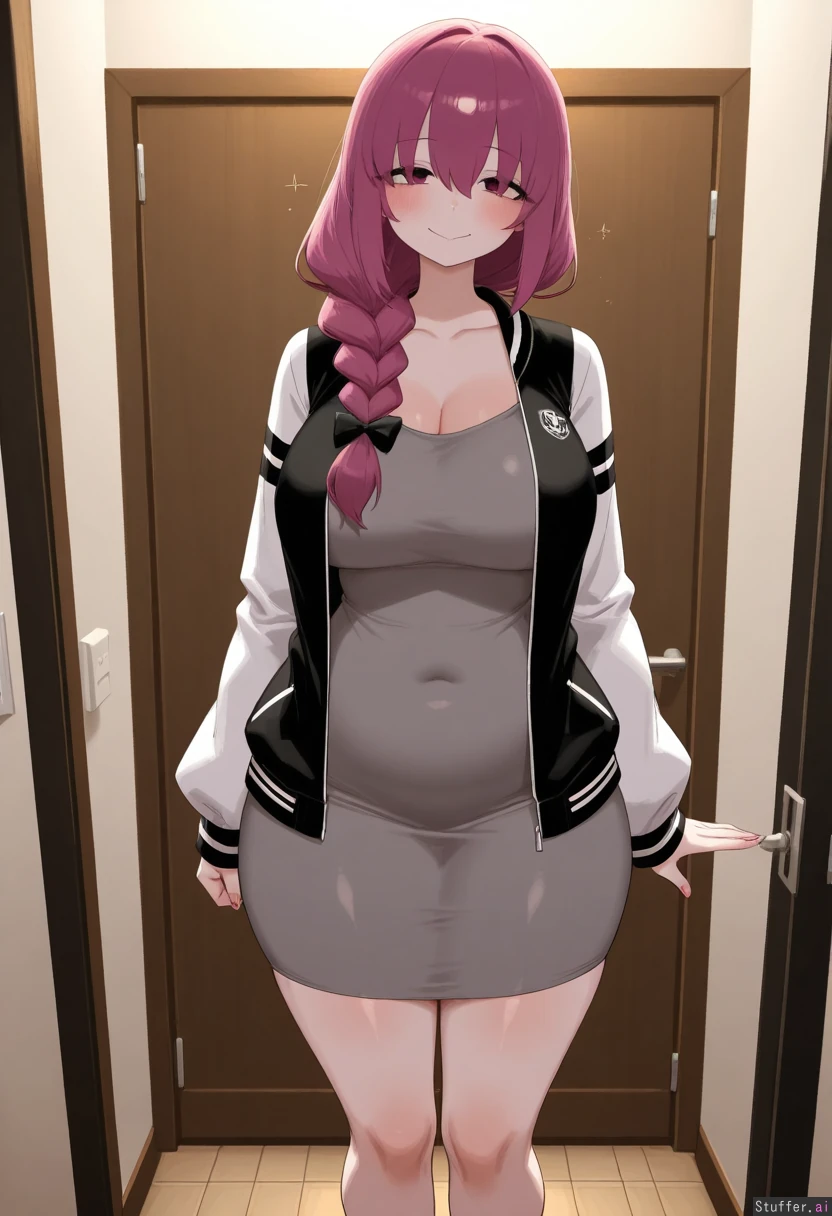 **base** absurdres, best_shading warm_lighting, best_quality, masterpiece, solo, high_resolution, high_rating **artist** RockSolidArt(artist), (usa37107692:1.2), (ohasi_art), (betterwithsalt), (pixiveo) **character** kikuri_hiroi(Bocchi_the_Rock), (28 years old) fitness_girl, mature_milf, mommy, house_wife, pink_eyes, purple_hair, **clothes** (Grey_summer_dress), black_sports_jacket(with white sleeves) , black_bow **settings** Standing in Doorframe, drunk, horny, smile **body** (Tall:1.4), long_legs ((Wide_hips), (gigantic_breasts), (gigantic_ass), (gigantic_thighs), (morbidly_obese_female), (love_handls), (Fat_arms:0.85), (fat_legs), :0.1),