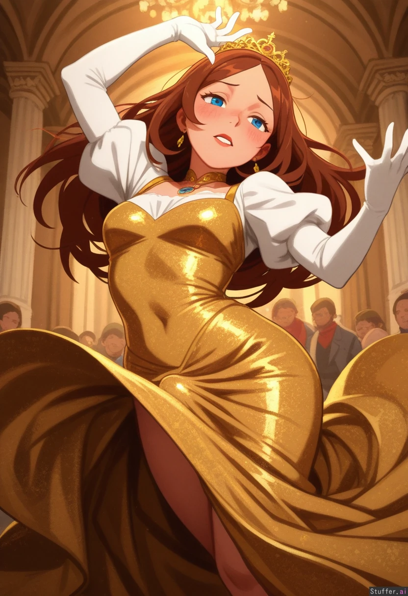 khyle(artist), anime trap, neck lenght weavy hair, brown hair, blue eyes, red lipstick golden glittery dress,gold dress, (white long sleeved gloves), golden tiara, thight dress, futanari, bulge shiloutte 1.2 , royal ballroom,royal palace,dynamic pose, blushing