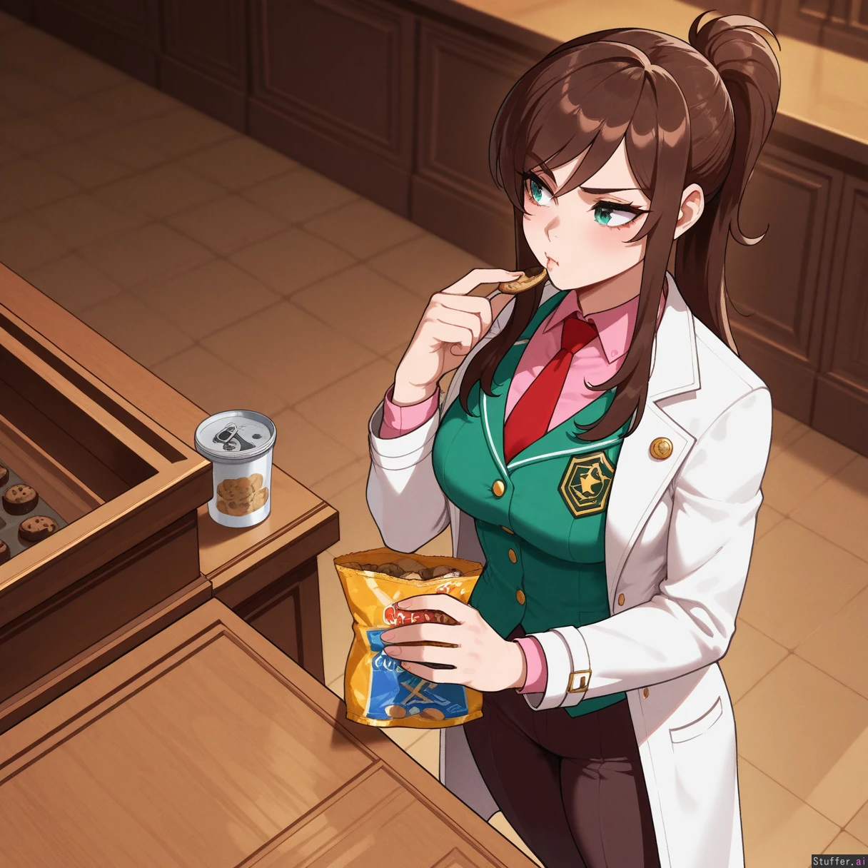 Masterpiece, best_quality, beautiful, vibrant colors, dim light, (1girl), alone, nyantcha(artist), Ema Skye, pink shirt, green vest with gold buttons, brown capri pants, red tie, white coat, teal eyes, pouting, eating chocolate chip, holding chips bag, courtroom, (overweight:0.5)