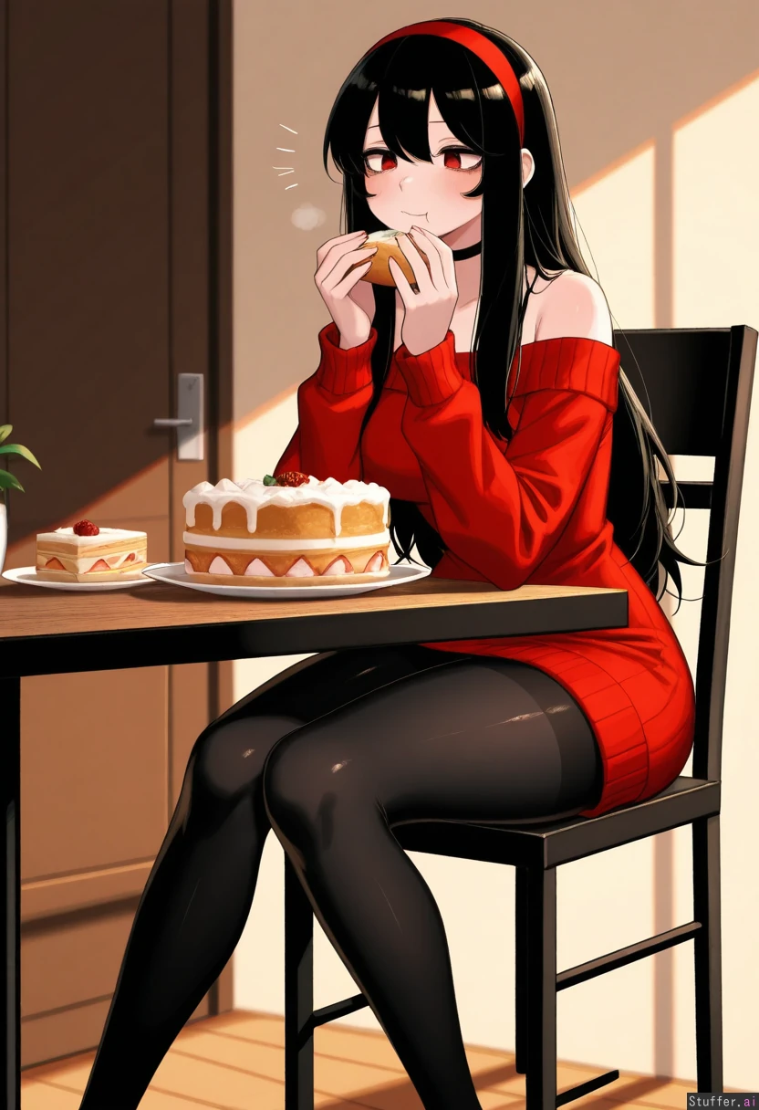 **base** absurdres, best_shading warm_lighting, best_quality, masterpiece, solo, high_resolution, high_rating **artist** RockSolidArt(artist), (usa37107692:1.2), (ohasi_art), (betterwithsalt), (pixiveo) **character** Yor_forger(spy_family), (42 years old) mature_milf, mommy, red_eyes **clothes** (Red_off_shoulder_sweater_dress), hair_band, black_tights, no_glasses, **settings** dining_room, sitting_on_chair, eating_cake, feedee, feederism, gigantic_cake_on_table, force_feeding **body** (Tall:1.4), long_legs ((Wide_hips), (gigantic_breasts), (gigantic_ass), (gigantic_thighs), (morbidly_obese_female), (love_handls), (gigantic_belly), (hyper_fat), (fat_rolls) (Fat_arms:0.85), (fat_legs), :0.1), small_breasts, skinny,