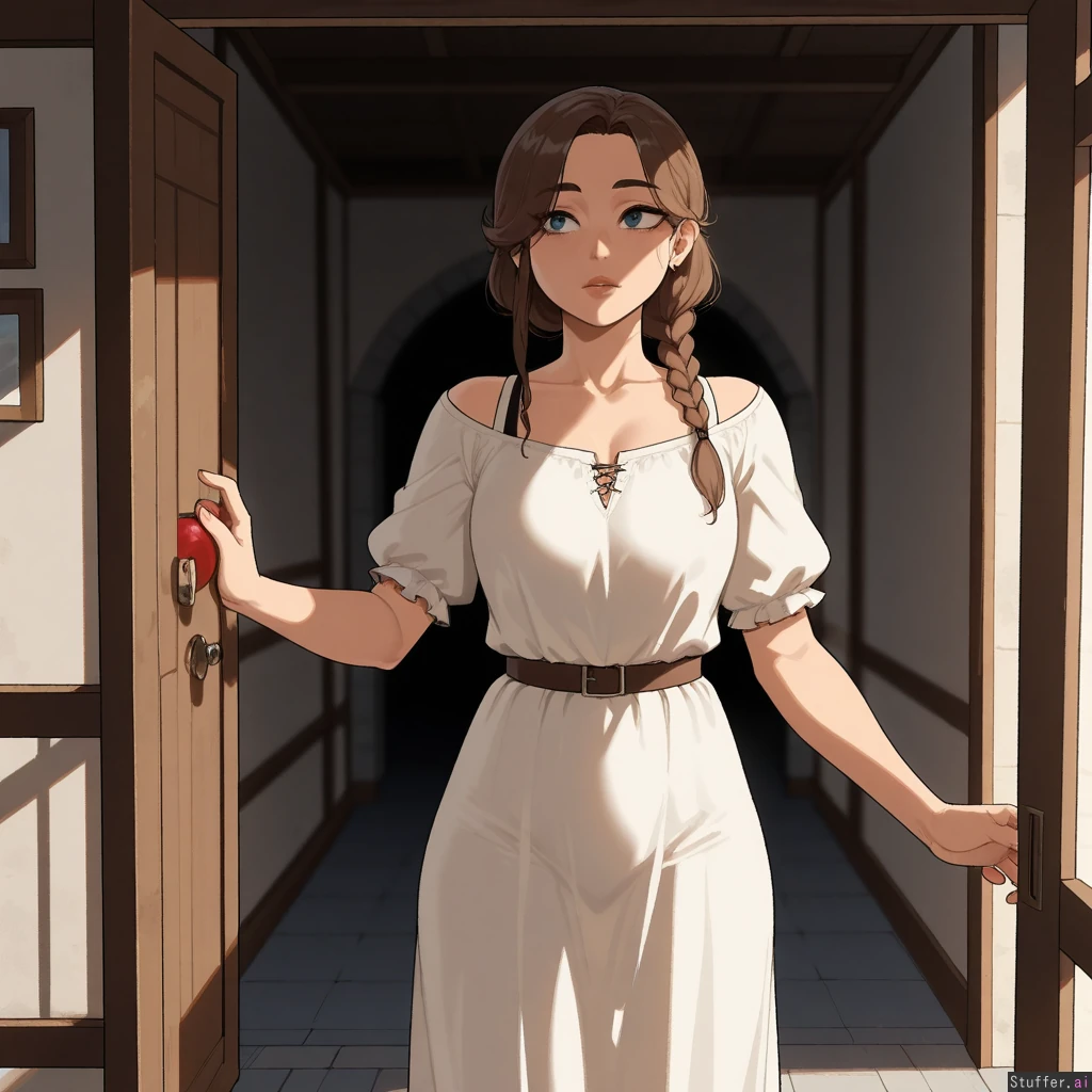 (masterpiece, amazing resolution , nyantcha(artist), krekkov (artist), KAMII MOMORU (artist), dramatic lightng, 8k, uhd), 1girl alone, solo, only one person, wearing a light blue floor-length loose dress, brown hair in a braid, wide blue eyes, neutral expression: 0.6 , skinny:1.5, stands with back to open window , holding an apple in right hand, examining the apple with curiosity, medieval europe bedroom background, empty room, no other people, front view, waist-up shot