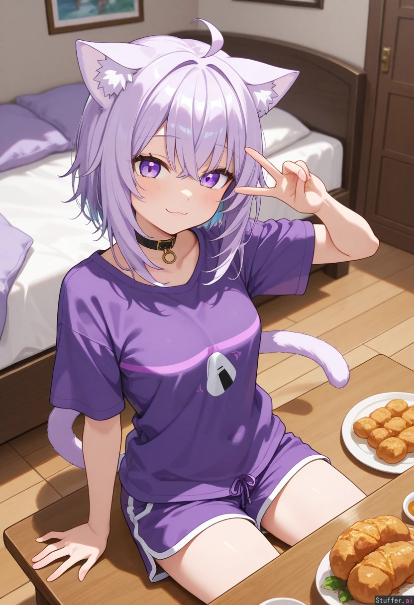 solo, small_breasts, 1girl , nekomata_okayu, purple_shirt , purple_shorts , sitting , peace_sign , smile , looking_at_viewer bedroom, (three-quarter_view), (overflowing food on a table) , ((fat , fat_belly , fat_ass , fat_thighs , double_chin , fat_arms ,):0.1) ,