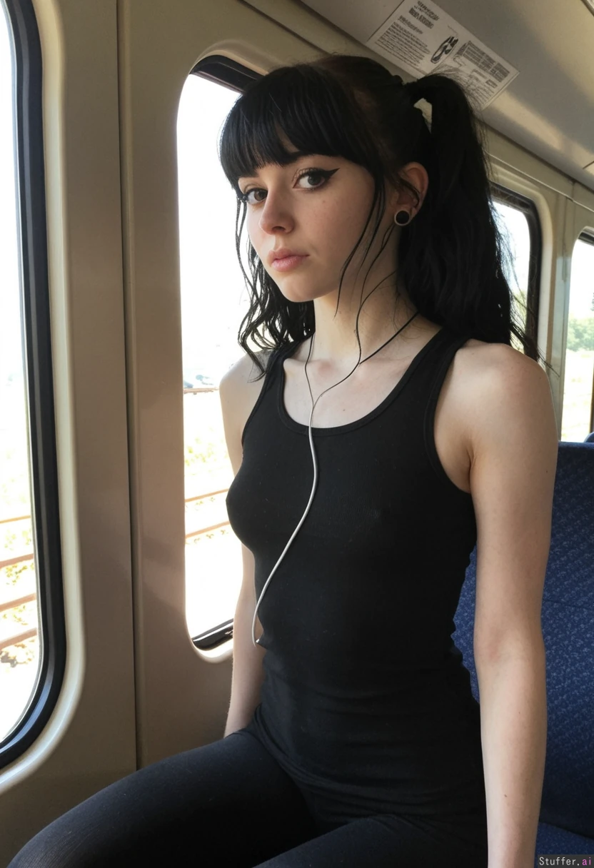 ((Highly realistic:1.9)) (25 year old) (beautiful face:1.2) ((Very Skinny:0.0)) Full body picture black wavy hair with bangs goth chick Wearing earbuds on the train Wearing a black tank top Staring outside the window