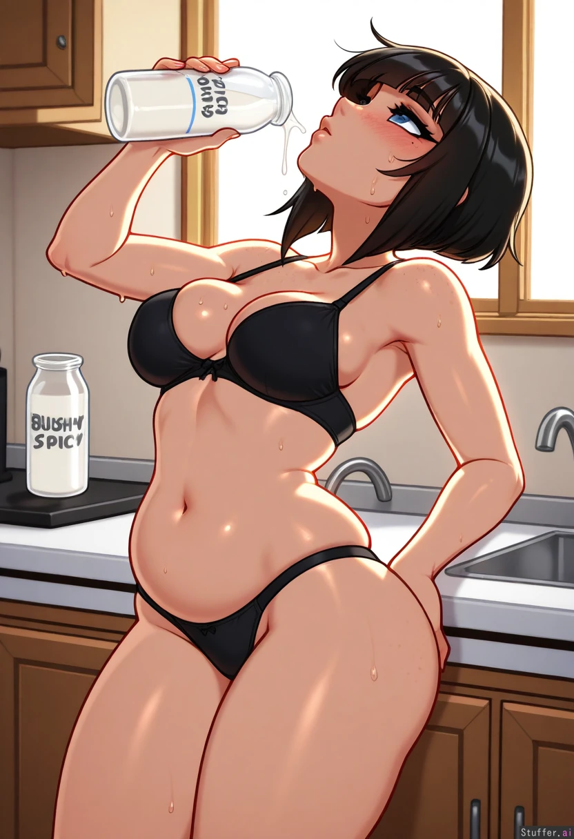 (highly detailed, best quality, masterpiece), (perfect anatomy, perfect proportions), (perfect lighting, warm lighting, vibrant colors, shadow, perfect shading), (beautiful face, beautiful eyes), (blushyspicy, merunyaa), (one girl, solo), (kitchen, window, golden hour lighting), (European girl, adult), (short black hair, inverted bob hair, blunt bangs, bangs over eyes), (blue eyes, narrow eyes, eyelashes, flared lashes), (brown skin, shiny skin, ((mole under eye, freckles, body freckles))), (fat lips), ((skindentation)), (black bra), (black panties), ((((blushing, sweating)))), (aroused, horny, heavy breathing), (curvy), (thick wide thighs), (medium breasts, perky breasts), (narrow waist), (big chubby belly), ((slight side view, standing, leaning back on kitchen counter, drinking huge milk bottle, holding milk bottle, milk dripping, head back, looking up))