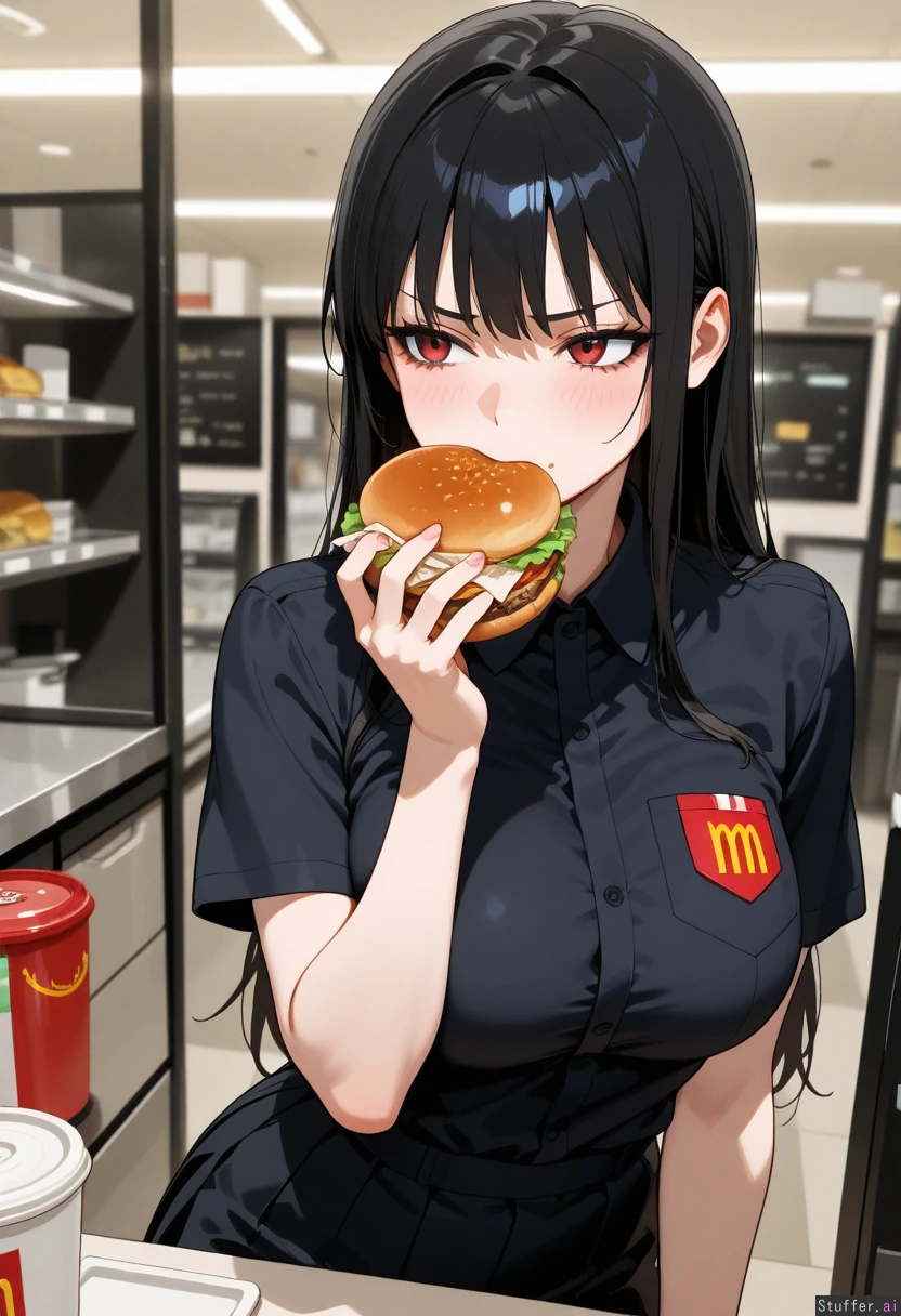 1girl, masterpiece, medium_breasts, (undersized black McDonalds fast_food_uniform, uniform getting tighter as she gains weight), (her breasts are growing and her body is getting pudgy from gaining weight), employee, bangs, black_hair, red eyes, solo, mascara, eyelashes, goth, annoyed. (she's ashamed that she's fattening up working at McDonalds). (she is addicted to burgers. She is eating a burger.)
