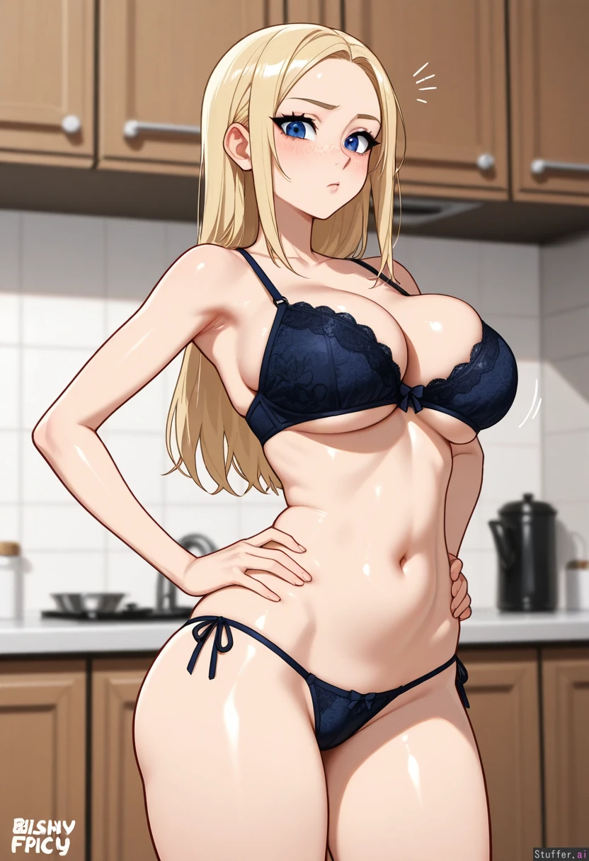 hdr, c.cu, blushyspicy, betterwithsalt:1.4, best quality, anime, beautiful, intricate details, pewbutt(artist), masterpiece, beautiful 8k, high resolution, maximum pixel density, masterpiece, (((highly detailed))), ((flawless)), (((high rating))), ((highly detailed face)), full resolution, 8k, high resolution, best quality, 1woman, milf, detailed eyes, ((solo)) Appearance: Long straight blonde hair, blue eyes, tan skin, freckles, blushing heavily, anime-woman, shocked expression, pouting, hands on hips Outfit: blue lace bra, black thong Location: in the kitchen (posing in kitchen), side-view, looking at viewer Modifiers: (Slim figure:1.8), (chubby belly:1.0), (morbidly obese ssbbw figure:1.0), voluptuous, (weight gain), (Huge breasts:0.75), (breast expansion), top heavy, underboob, bursting breasts Wide waist, thick thighs, wide hips,