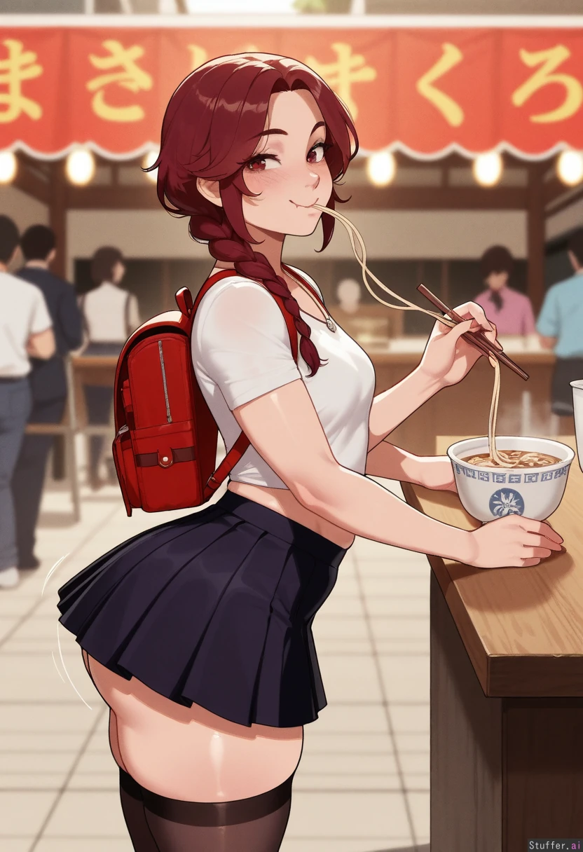 High quality, 4k, masterpiece, flawless, motion lines, perfect shading, bright livid, street view, side view, Nyantcha(artist), KAMII MOMORU(artist), Solo adult woman, Flawless beauty, Dark Red hair, Braided hair, Shiny clean hair, Cute blushing shy, (Happy eyes:1.5), White shirt, (Sweet fluffy skirt) Punk wooly stockings, Necklace, Small backpack, Perky cute, (Slim chest:1.1), (Thick thighs:1.0), (Wide hips:1.0), Toned belly lines, (Chubby belly:1.0), ass, Food Festival, Podium in background, Standing bend forward against a standing table, (Chewing and slurping noodles with chopsticks:1.5), Bowls of noodles