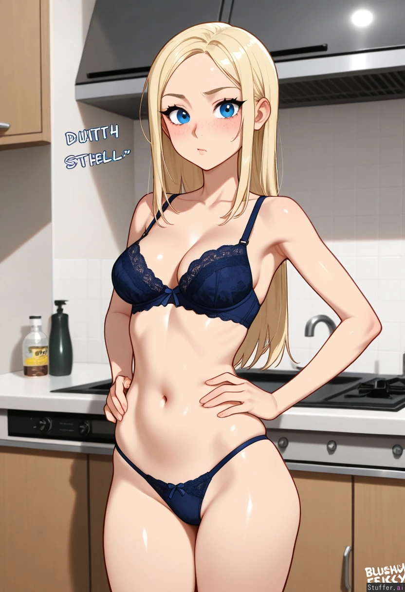 hdr, c.cu, blushyspicy, betterwithsalt:1.4, best quality, anime, beautiful, intricate details, pewbutt(artist), masterpiece, beautiful 8k, high resolution, maximum pixel density, masterpiece, (((highly detailed))), ((flawless)), (((high rating))), ((highly detailed face)), full resolution, 8k, high resolution, best quality, 1woman, milf, detailed eyes, ((solo)) Appearance: Long straight blonde hair, blue eyes, tan skin, freckles, blushing heavily, anime-woman, shocked expression, pouting, hands on hips Outfit: blue lace bra, black thong Location: in the kitchen (posing in kitchen), side-view, looking at viewer Modifiers: (Slim figure:1.8), (chubby belly:1.0), (morbidly obese ssbbw figure:1.0), voluptuous, (weight gain), (Modest breasts:0.75), (breast expansion), (Wide waist:1.0), (thick thighs:1.0), (wide hips:1.0),