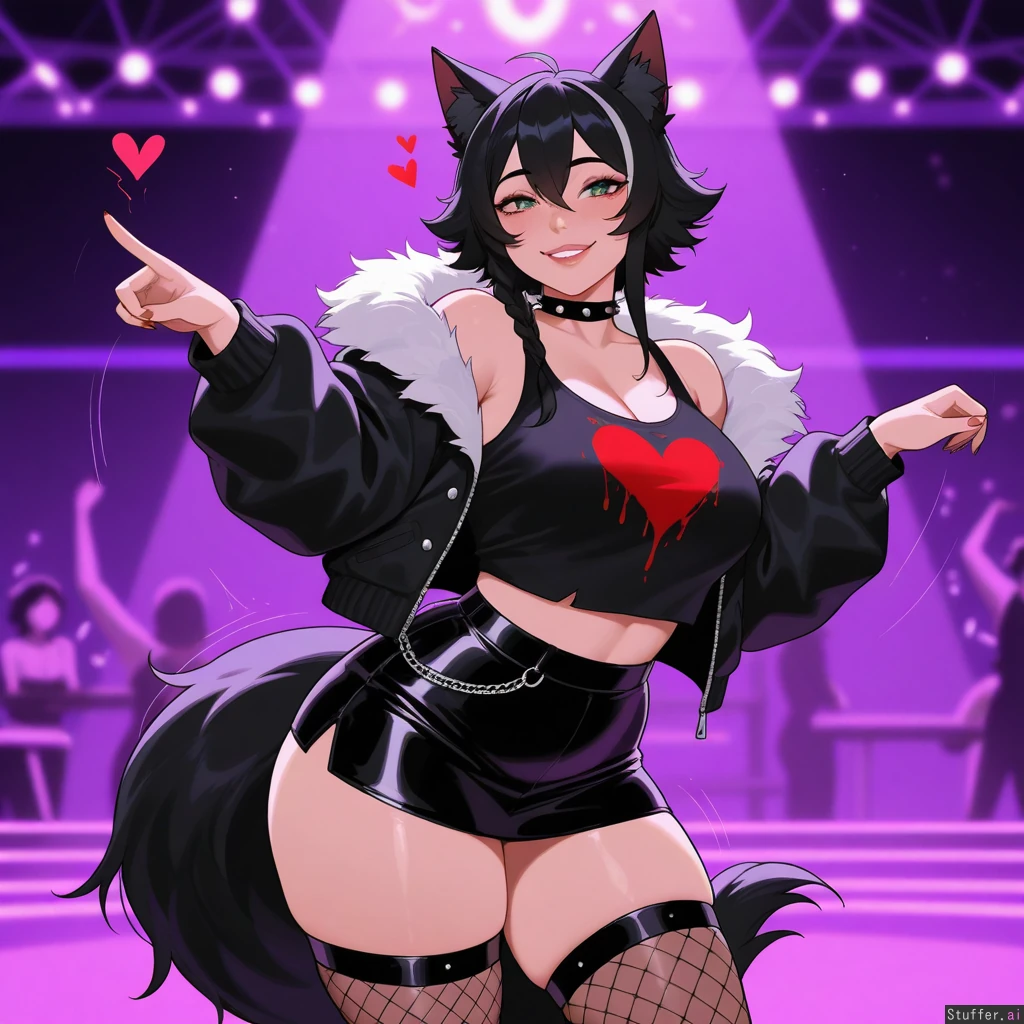 High quality, 4k, masterpiece, flawless, motion lines, perfect shading, bright livid, facing front Nyantcha(artist), KAMII MOMORU(artist), Solo adult woman, One person, Flawless beauty, Wolfgirl, Wolf ears, Wolf tail, Green eyes, Raven Black hair, Braided hair, Shiny clean hair, Cute blushing shy, Happy eyes, White tank top, Punk fluffy jacket, Black punk shirt with evil red heart logo, Black punk skirt, Punk wooly stockings, Punk spiked choker, (Big boobs:0.0), (Chubby:0.0), (Overweight belly:0.0), (fat hips:0.3), (Thick thighs:0.5), (Big overflowing ass:0.0), (Bubble butt:0.3), Nightclub, Dancing,
