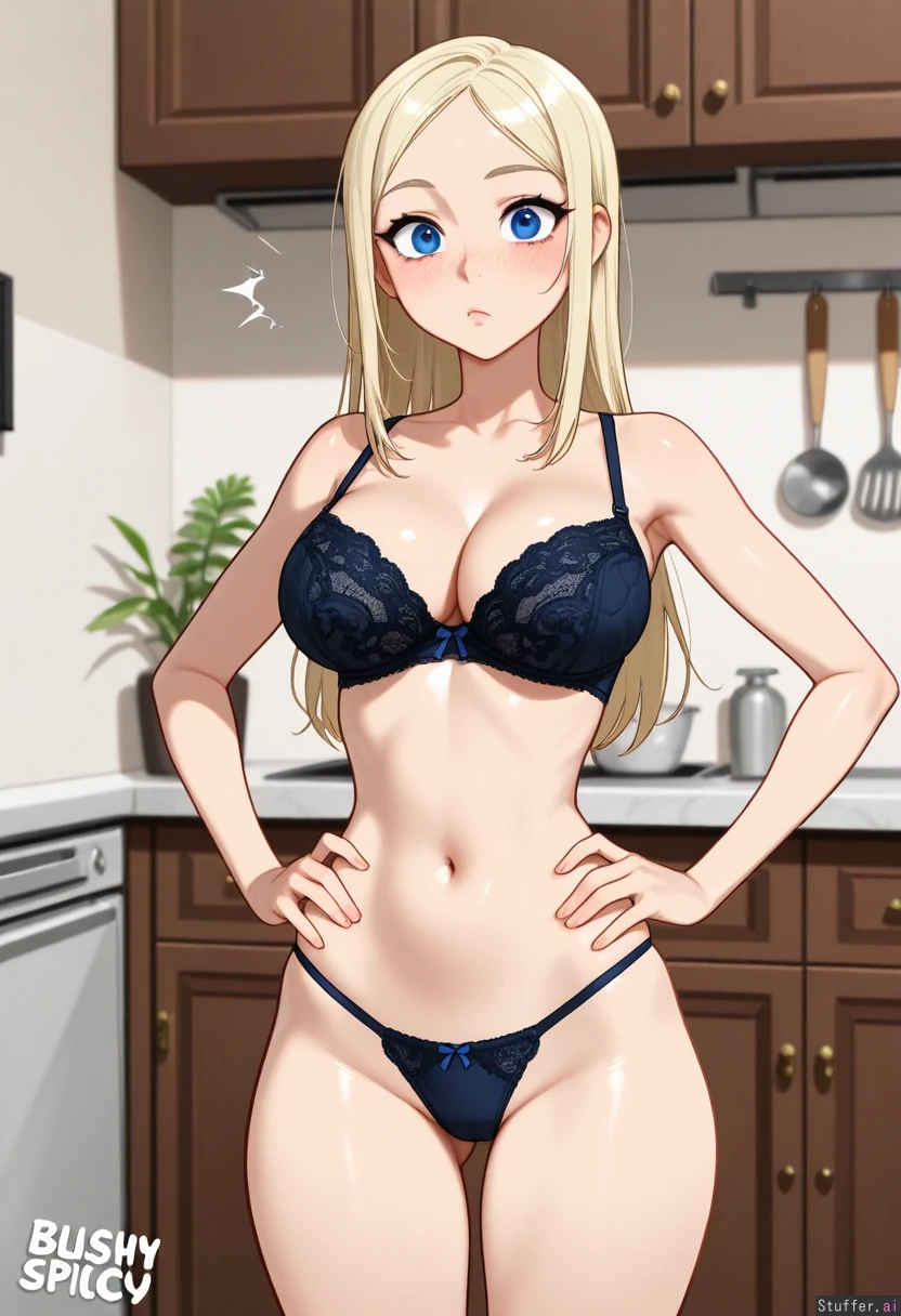 hdr, c.cu, blushyspicy, betterwithsalt:1.4, best quality, anime, beautiful, intricate details, pewbutt(artist), masterpiece, beautiful 8k, high resolution, maximum pixel density, masterpiece, (((highly detailed))), ((flawless)), (((high rating))), ((highly detailed face)), full resolution, 8k, high resolution, best quality, 1woman, milf, detailed eyes, ((solo)) Appearance: Long straight blonde hair, blue eyes, tan skin, freckles, blushing heavily, anime-woman, shocked expression, pouting, hands on hips Outfit: blue lace bra, black thong Location: in the kitchen (posing in kitchen), side-view, looking at viewer Modifiers: (Slim figure:1.8), (Big fat belly:0.8), (morbidly obese ssbbw figure:0.8), voluptuous, (weight gain), (Large breasts:0.8), (breast expansion), (Wide waist:1.0), (thick thighs:1.0), (wide hips:1.0),