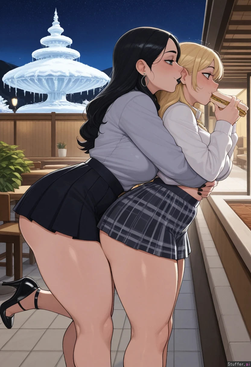 4k, ultra hd, perfect masterpiece, flawless detail, best quality, motion lines, side view, (Krekkov(artist)), (KAMII_MOMORU(artist)), Duo female, (Woman only:1.5), Incredibly handsome, Blond, Frizzy hair, Sexy pose, Frisky blushing, Earrings, Necklace, Tattoos, Black lipstick, Black eye shadow, Black nails, (Winter Skirt:1.5), Long sleeves, Strap heels, Black thong, Slim chest, (Perky thighs:1.5), (Chubby belly:0.9), Starry sunset, Outside, Standing, Mountainous, Restaurant, Plants, Fountain, (Hugging from behind:1.3), (Eating a sandwich:1.5),