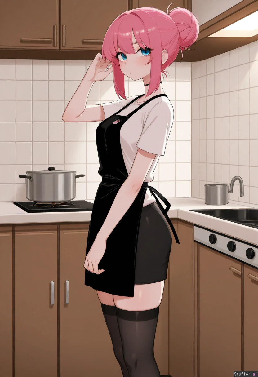 **base** absurdres, best_shading warm_lighting, best_quality, masterpiece, solo, high_resolution, high_rating **artist** RockSolidArt(artist), (usa37107692:1.2), (ohasi_art), (merunyaa) **character** mature_milf, Michiyo Goto(Bocchi_the_Rock!), pink_hair, blue_eyes, bun_hairstyle, **clothes** white_shirt, black_apron, black_skirt, Black_stockings **settings** kitchen, standing, side_view, **body** (Tall:1.0), long_legs ((Wide_hips), (huge_breasts), (gigantic_ass), (gigantic_thighs), (morbidly_obese_female), (gigantic_belly), (love_handls), (Fat_arms:0.85), (fat_legs), :0.1) skinny, small_breasts,